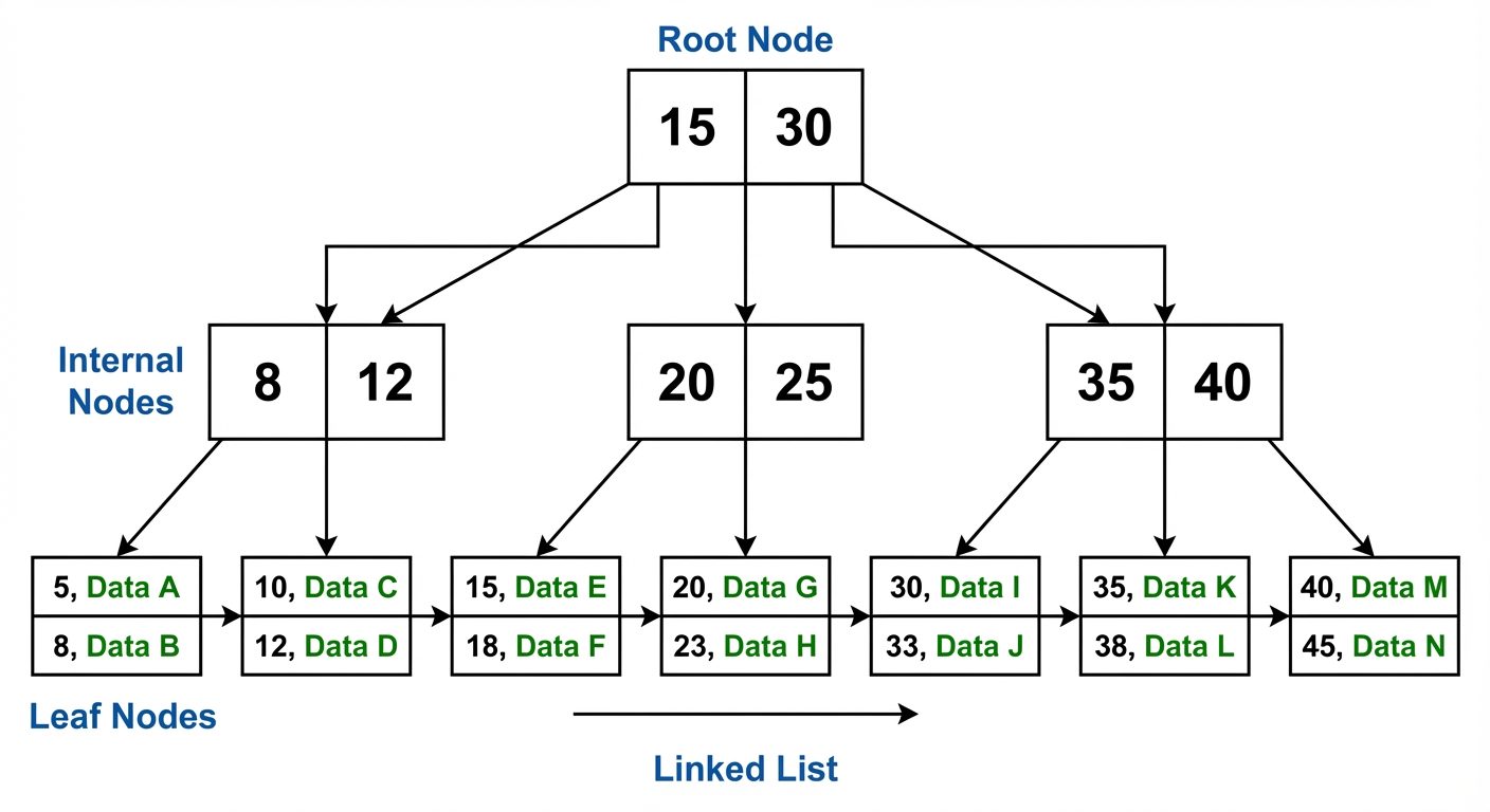 - Leaf nodes are linked together (Linked List) to facilitate sequential access.